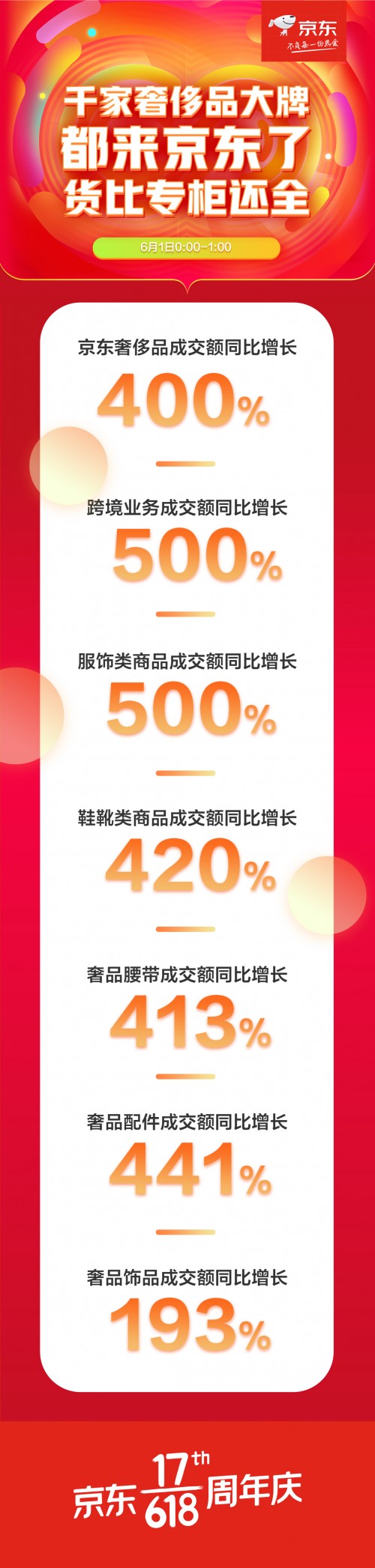前1小时,京东奢侈品迎来爆发式增长,成交额同比增长400%。其中,跨境业务成交额同比增长500%,服饰类商品成交金额同比增长500%,鞋靴类商品成交金额同比增长420%,奢品箱包成交额同比增长100%,奢品腰带成交额同比增长413%,奢品配件成交额同比增长441%,奢品饰品成交额同比增长193%。