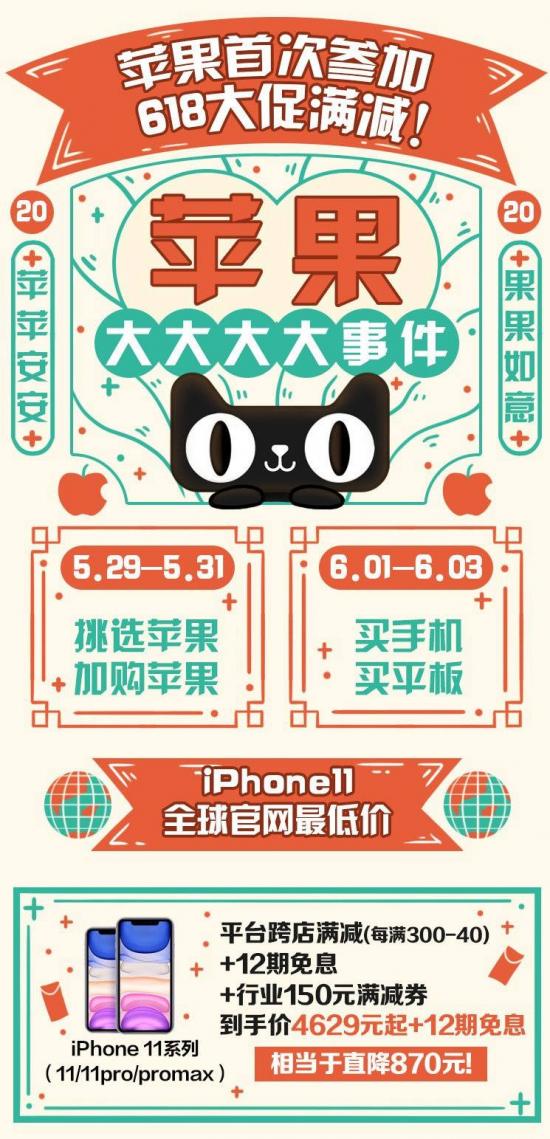 5月29日,苹果官方宣布第一次以官方形式参与天猫618折扣活动,苹果天猫官方旗舰店iPhone11等全线产品支持跨店满减(每满300减40)及提供150元会场优惠券,相当于全场8折起。