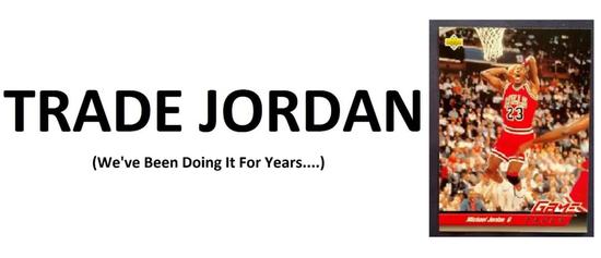 一周后,一波未平一波又起,在原地又竖起了第二座广告牌,上面除了“交易乔丹”这几个大字外,还在下面加了一句话:“我们这样做已有多年了……”而在这些文字旁边,还附有一张乔丹球星卡图片,图片中的乔丹身穿红色公牛球衣,正持球飞往蓝框。