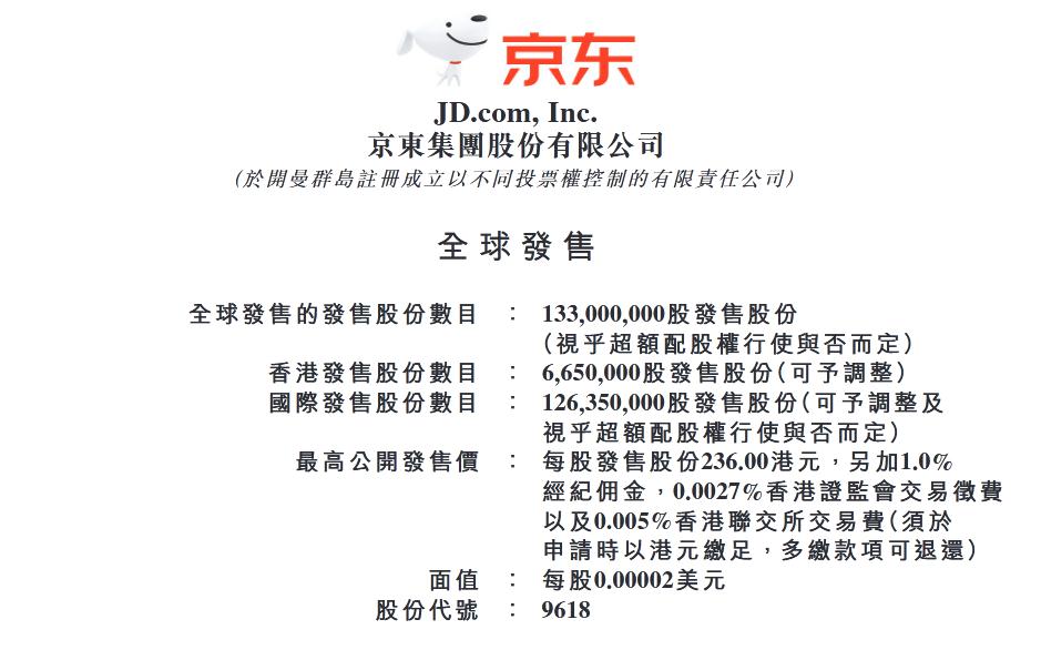 公告显示,京东在港上市最高公开发售价为236港元/股,将发行1.33亿股发售股份,股份代码9618。公开发售包括:香港公开发售(初步于香港提呈665万股发售股份(可予重新分配),占全球发售初步提呈的发售股份总数5%);国际发售(初步提呈1.2635亿股发售股份(可予重新分配及视乎超额配股权行使与否而定,占全球发售初步提呈的发售股份总数95%)。