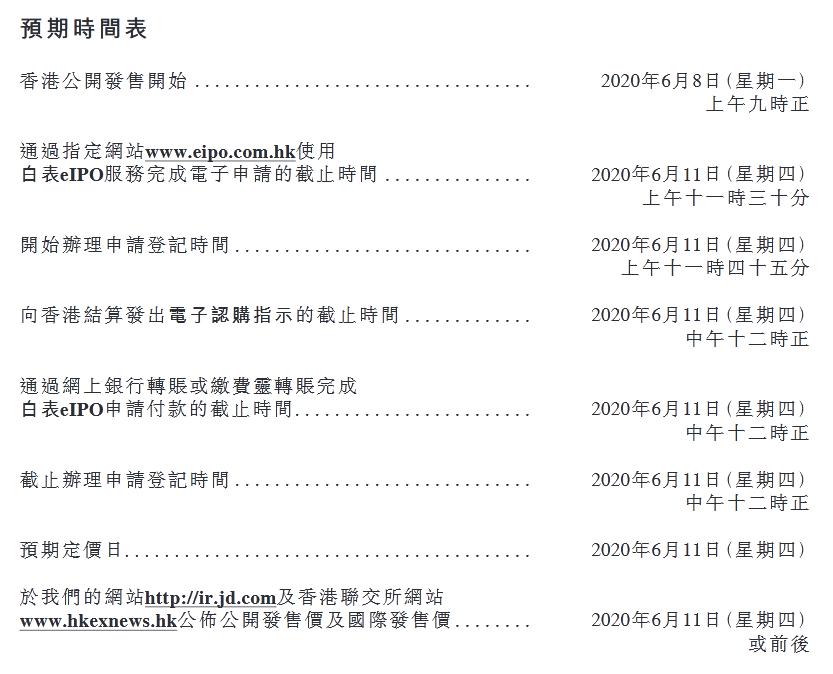 公告称,京东预期将于2020年6月17日(星期三)在其网站及香港联交所网站公布国际发售踊跃程度、香港公开发售的申请水平及香港发售股份分配基准。