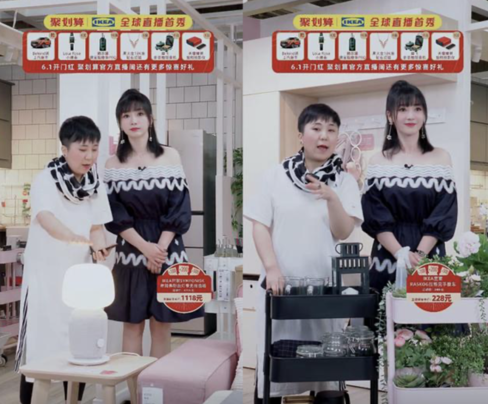 品牌化直播场景也是内容活化的重要部分。聚划算明星主播柳岩在6月1日的直播诠释了这一点。当天,柳岩在宜家上海店内出镜种草,原汁原味的宜家商场化身为明星私房,给观众展示了部分宜家好物,手推车、单人沙发扶手椅、台灯带音箱。除此之外,还有40余款不同品牌的女生好物。
