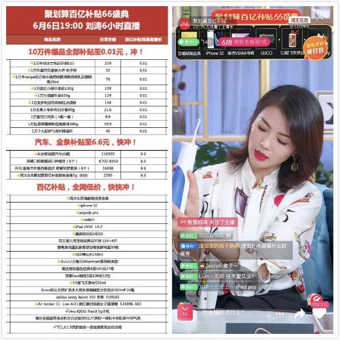 刘涛在6月6日的聚划算百亿补贴66盛典真正兑现了作为“刘一刀”爆发力,直播长达六小时,电动牙刷、星巴克、小龙虾、防晒霜等10类爆款商品,万份库存,统统补贴到1分钱;包括头部大品牌iphone、戴森、switch等热销尖货也击穿价格底线。