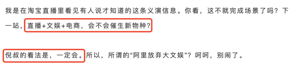 一周之前,倪叔在《王兴diss阿里文娱的背后,有什么秘而不宣的目的?》一文的结尾处提到了这样的观点:直播+文娱+电商,一定会催生新物种。