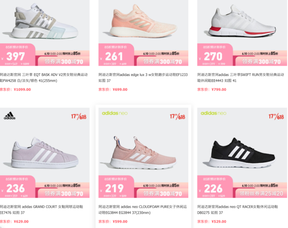 每年一度的 “618购物节” 又来了。从来不怎么打折的耐克和阿迪达斯都大幅降价了。阿迪达斯大部鞋的实际价格竟然都低于5折。