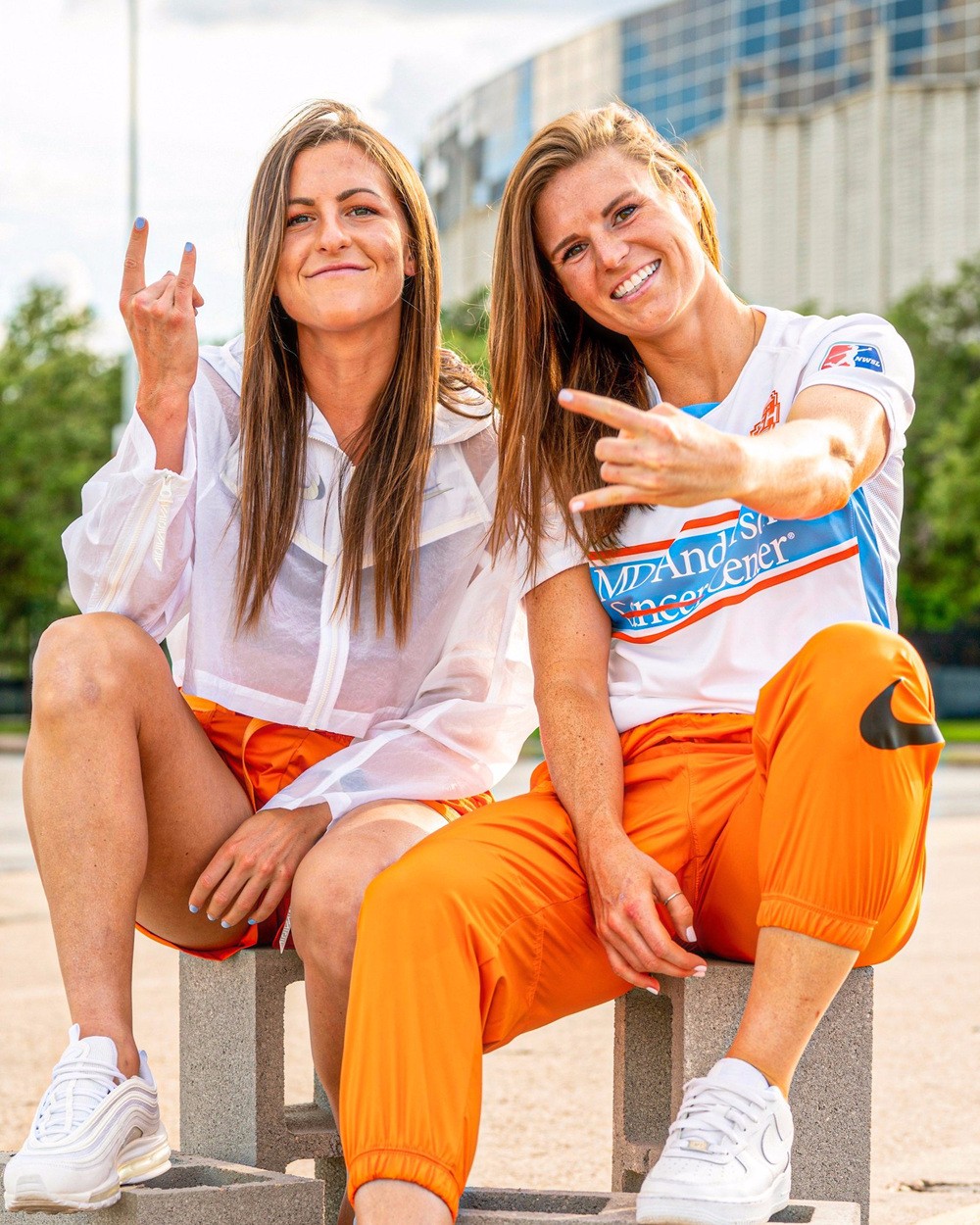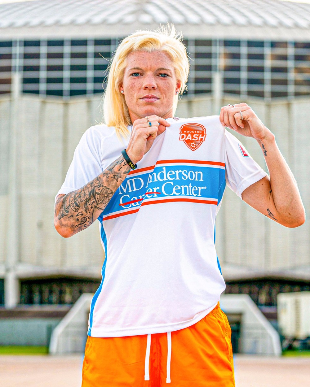 球衣胸前的橙色俱乐部徽章歌颂俱乐部引以为傲的传统,球衣身体两侧加入天蓝色条带,再次展现休斯敦作为“太空城”的特点。休斯敦冲击女足的球员们身着全新客场战袍在太空巨蛋球场前拍摄新球衣宣传照,再次向这座见证休斯敦体育历史的伟大建筑致敬。
