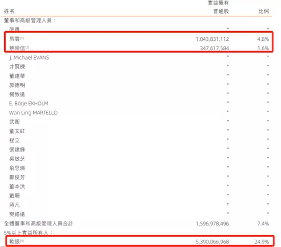 从报告上看,去年6月,马云持股比例为6.2%,软银为25.9%,同时阿里巴巴赴港上市提交的招股书中,马云持股比例为6.1%,蔡崇信为2.0%。