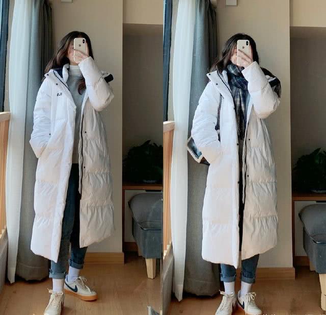 除了长款羊毛羔外套,这款长款羽绒服更加保暖,更显清纯。白到发光的面料真的很衬肤色,小姐姐选用白色高领毛衣做内搭,文静甜美,在室内穿也能清新可人。长款羽绒对走的女生来说确实难驾驭,但是,只要长度选的合适再矮的人也能穿出170的效果。建议大家购买的时候要选择衣身刚过盖过小腿肚但是不盖过脚踝的长度。同样内搭一条修身牛仔裤,卷起裤腿的设计露出高筒袜,既能保护脚踝又能显瘦增高。