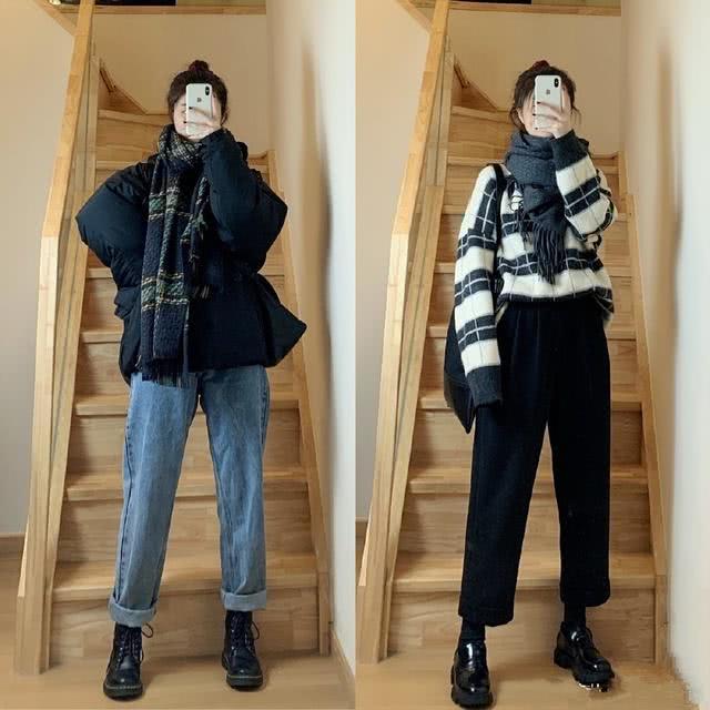黑色羽绒服也是必不可少的,尤其对于小个子女生,为了穿衣服不犯错,基本上都会选择黑白灰的基础款。内搭一件很有设计感的针织毛衣,黑白色系相间分布,出席任何场合都不会掉价。下装可以搭配蓝色直筒裤也可以搭配黑色直筒裤,裤腿能露出脚踝效果最佳。