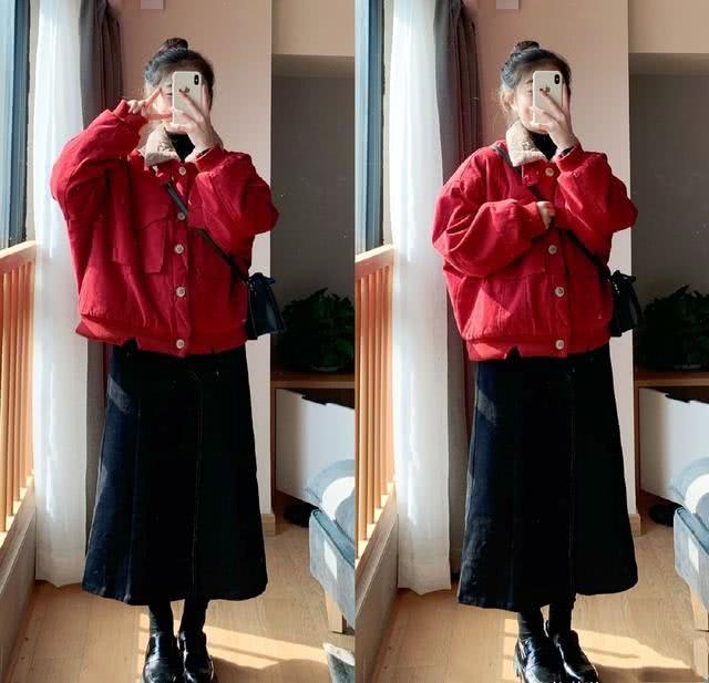 为了迎接新年,一件红色外套必不可少,这种夹克棉服式的外套非常显瘦非常百搭。从外表看,就是一件春秋天穿的普通外套,看上去干净利索,有效绕开了冬季的臃肿累赘。从里面看,一层保暖又有质感的水貂绒依附在此,时尚保暖两不误。下装搭配一条黑色半身裙,A字型的设计本身就很修饰身材,更何况还有黑色的加持。裙子和鞋子采用顺色搭配,有视觉增高的效果。