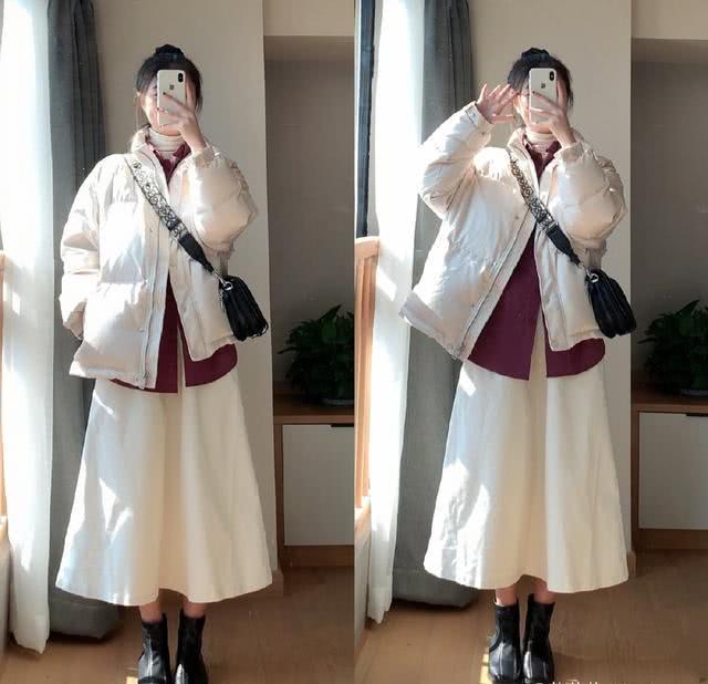 相信大家对叠穿都很有见解,小个子女生也可以尝试,小姐姐一件米白色高领内搭搭配一件砖红色衬衫,大面积纯色调碰撞符合大众审美。外搭一件短款羽绒服,经典款的设计省时省力,百搭耐穿。下装搭配一条纯棉大百褶半身裙,高腰的设计可以把衬衫衣角塞在里面,腰部因此也会利索很多。