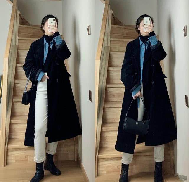 结果还是不能舍弃长款毛呢,黑色面料看上去干净素雅,挺括有型,自然垫肩的效果也可以增加气质。内搭很有层次感,而且内外呼应,高领毛衣搭配蓝色衬衫,颜色素雅整洁,看上去赏心悦目。下装搭配一条白色直筒裤,高腰设计把累赘的内搭通通塞在里面,明确腰线也是小个子女生必学的一种穿搭技巧。