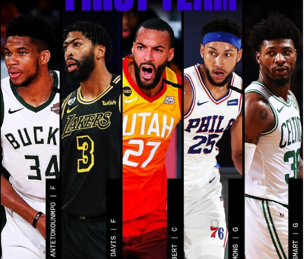 最佳防守一阵名单为:戈贝尔(180分),浓眉哥(187分),字母哥(195分),斯玛特(152分),本-西蒙斯(185分)。