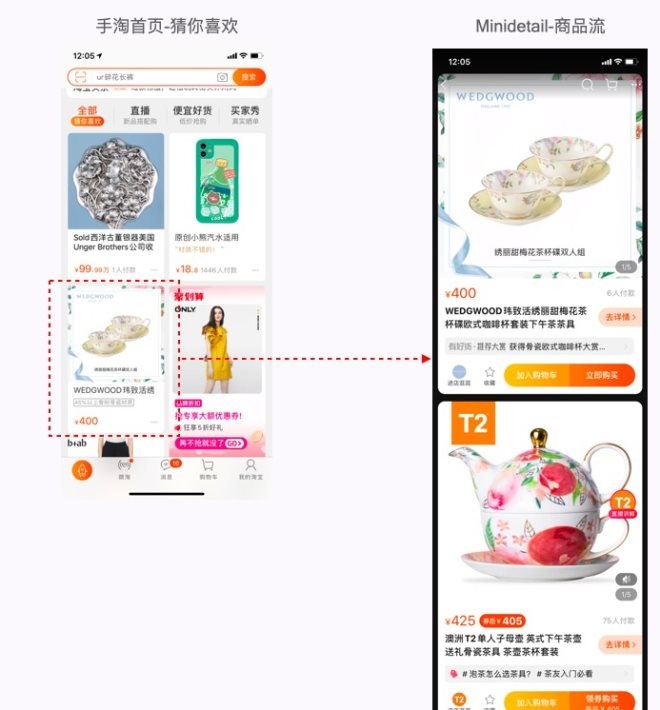 增加的微详情(Minidetail),是此次升级最核心的部分之一。什么是Minidetail?简单说,点击首页的“猜你喜欢”进入商品页,原先的图文详情页变成了沉浸式的商品信息流。用户可以持续下滑浏览商品的同时,还可以在商品流中直接成交购买,实现“边逛边买”的体验。