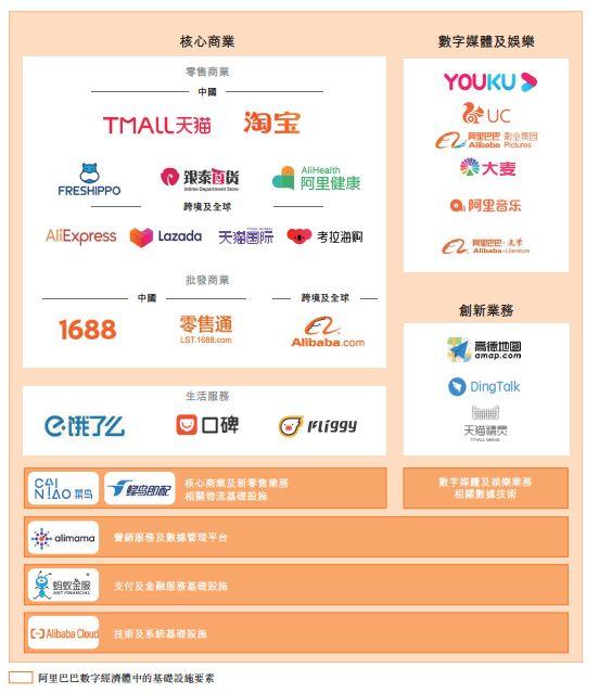 其一是淘宝、天猫、农村淘宝、阿里巴巴等为代表的核心电商业务,以及以全球电商平台速卖通、东南亚电商平台LAZADA为代表的国际业务。