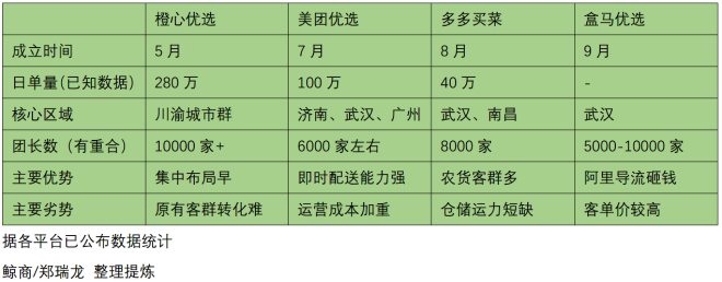 在阿里计划以内部赛马机制杀入社区团购时,拼多多已不动声色地提前布局,8月多多买菜于武汉、南昌两地上线,颇有“打响第一枪”的气势。9月侯毅负责的盒马优选事业部成立,一口气要招5000名团长,同样首发武汉。而这个月底,橙心优选自称,日单量已经突破280万单。
