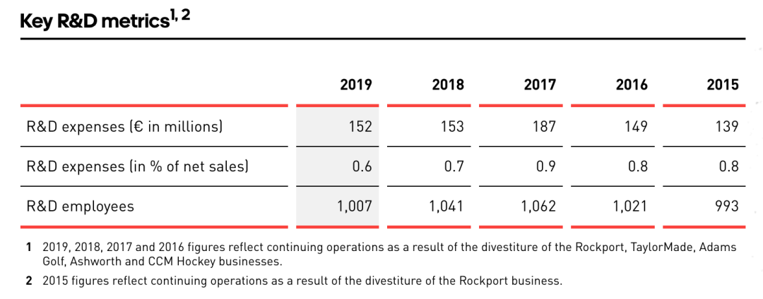 事实上,阿迪达斯在偏向时尚化产品策略后,就逐步在研发费用(R&D expense)上有所收窄。根据阿迪达斯近五年年报显示,2017年研发费用到达1.87亿欧元顶峰后,2018年及2019年逐年回落,研发费用占比也逐年下滑,从2017年0.9%滑落至2019年0.6%,研发人员数量也从2017年的1062人,降至2019年的1007人。