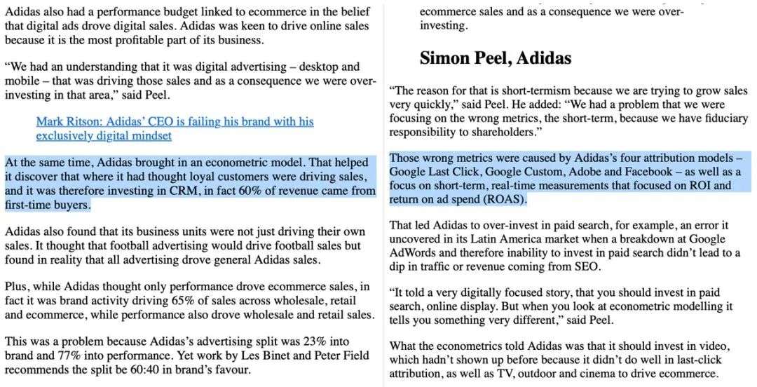 去年国内营销圈中,曾有一篇《阿迪达斯30亿的教训》刷屏,文内援引阿迪达斯全球媒介总监Simon Peel采访内容,表示阿迪达斯近年来在数字营销渠道中进行了过度投放,从而牺牲了品牌建设。采访原文中,阿迪达斯表示营销支出的77%在效果广告,而仅有23%用于品牌建设。