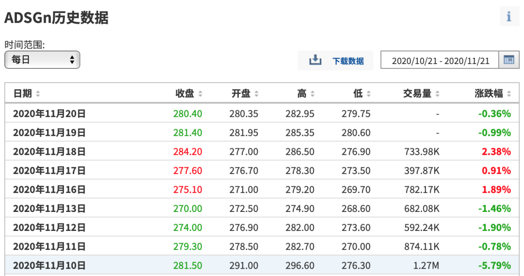 阿迪达斯(ADSGn)近段时间在法兰克福交易所的交易信息