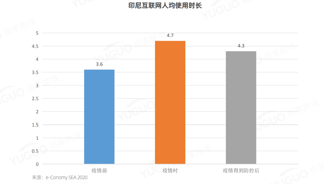 根据谷歌、淡马锡及贝恩公司联合出版的e-Conomy SEA 2020相关数据显示,目前,印尼的互联网人均使用时长已从疫情前的3.6小时/天增至目前的4.3小时/天。这些因素催生出了印尼地区包括电商版块在内的高速发展的互联网经济。
