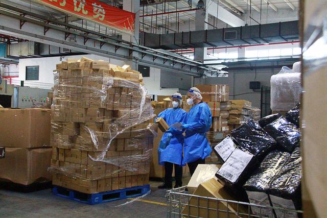 广州白云机场海关关员对进口跨境电商包裹进行巡仓监管。