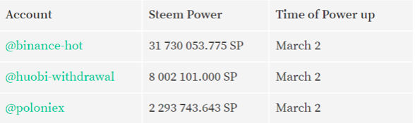 3月2日,币安、火币以及Poloniex交易所账户被Steemit社区监控到,汇集了超过4200万个该项目的投票权重,其中币安有3170万个,火币有800万个,Poloniex有220万个,通过大规模票量操控,让孙宇晨利益相关方占据了公链出块负责人名单前20的位置。