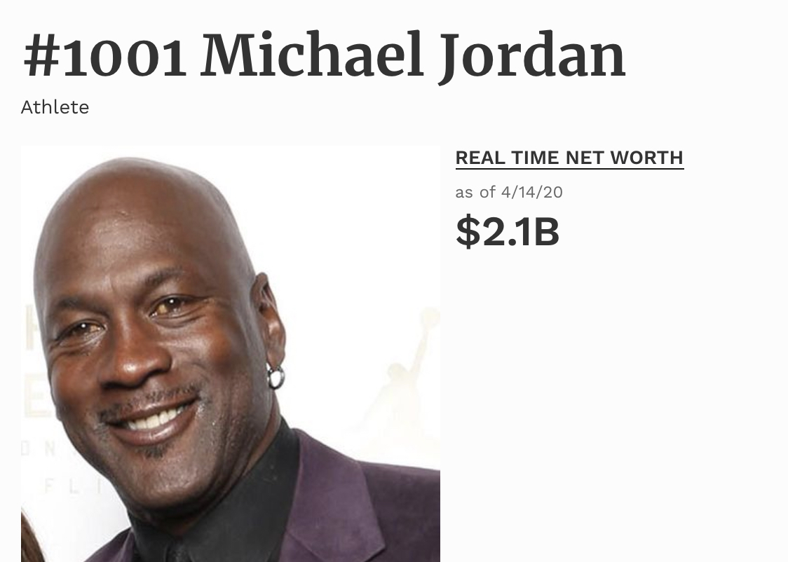北京时间4月15日,《福布斯》更新了2020全球富豪排行榜,黄蜂老板迈克尔-乔丹以21亿美元的身价排在第1001位,是体育行业为数不多的入选者之一,更是排名最高的退役运动员。
