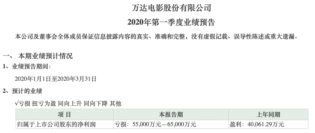 4月14日,万达电影发布一季度业绩预告,财报显示,其预计今年一季度为亏损状态,亏损规模在5.5亿元-6.5亿元之间。