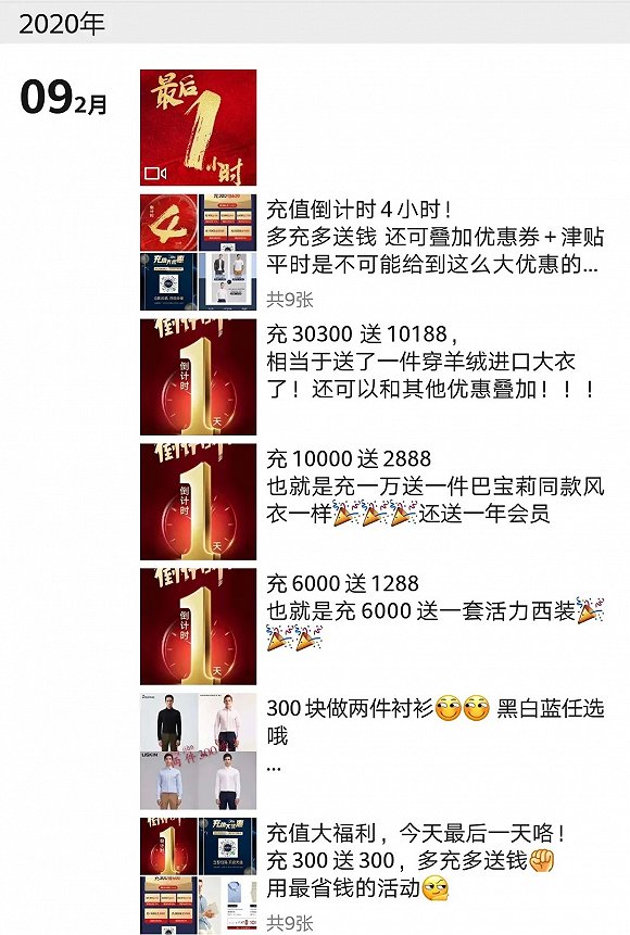 衣邦人某一线着装顾问2月份朋友圈的促销轰炸。截图自朋友圈