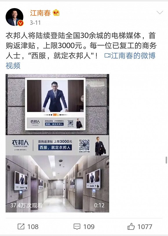 江南春在微博上宣布衣邦人电梯广告。截图自weibo