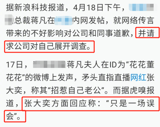 之后据媒体透露,蒋凡在公司内部发了道歉信,称因为自己家人的言论给大家带来不好的影响,同时请求公司对自己展开调查。而这也坐实了“花花董花花”的确是蒋凡的妻子。不过与此同时,张大奕方对此也秒回应,称“都是误会,没事了没事了”。