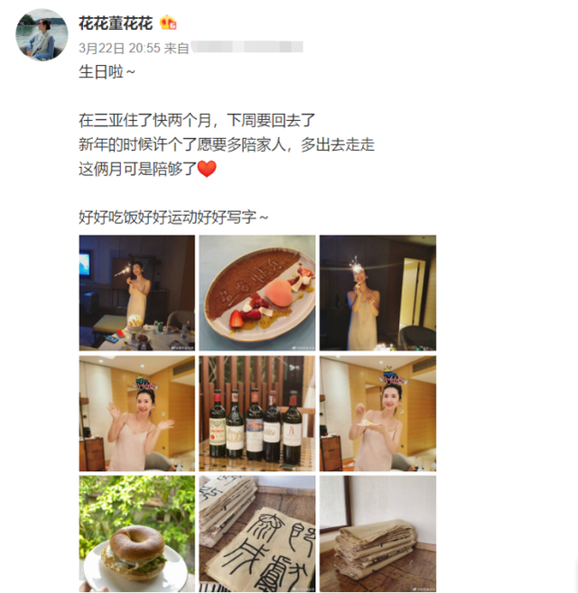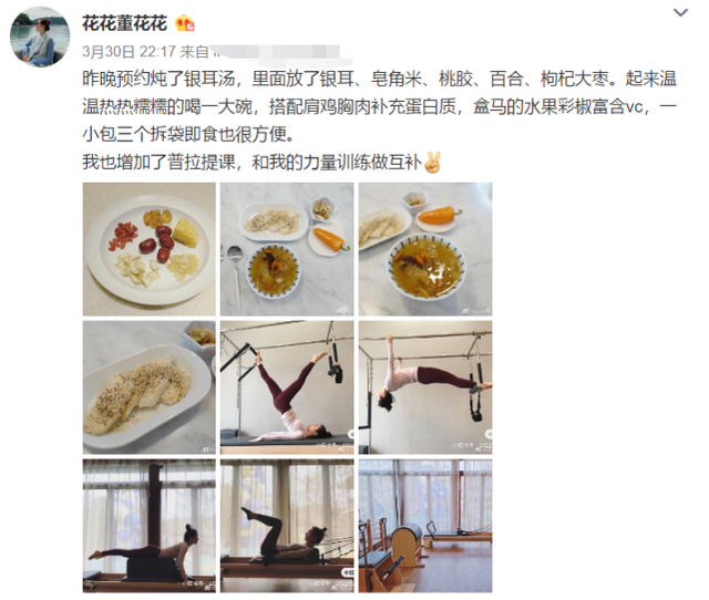 翻看董花花的动态,她经常会分享美食料理,而且都是自己做的。除此之外还保持着日常运动,做普拉提和各种力量训练,还会练毛笔字陶冶情操。偶尔会到三亚度假,享受海滩和阳光,同样不会忘了和大家分享美食,出入场合也都是高级奢侈品店铺。