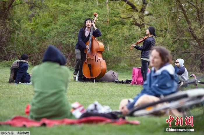 当地时间2020年4月25日,德国柏林,两名音乐家在Gleisdreieck公园演奏。