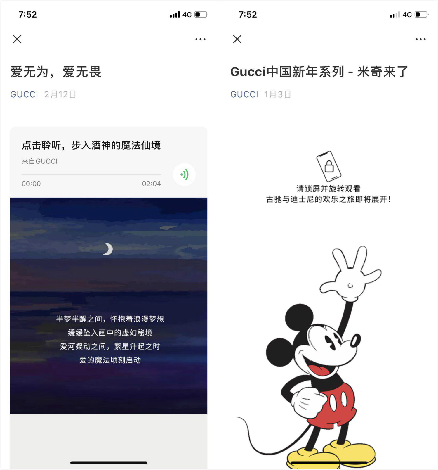 针对中国市场,自2017年登陆微信公众号以来、Gucci也通过这一平台在中国新年、520、母亲节等中国节日多次推出节日营销策划等活动。