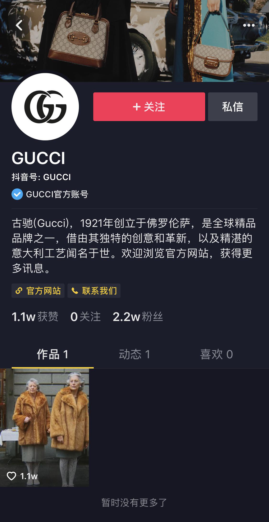 截至发稿前,Gucci 抖音账号粉丝数量为2.2万,品牌所发布的第一条短视频为两位老年模特穿着泰迪熊外套和复古运动鞋在街头舞动的画面,配文为“一起舞动抖一下”。视频中的音乐听起来似乎也很有抖音专属BGM。