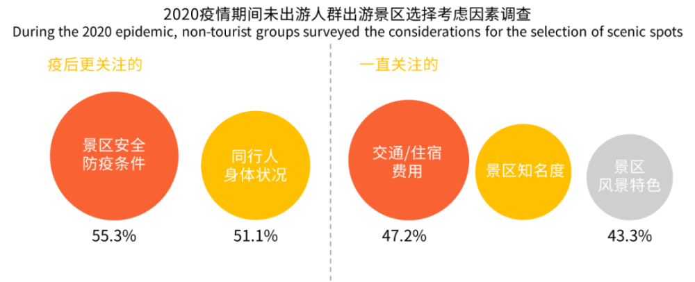 艾媒咨询2019-2020中国旅游景区门票在线预订市场研究显示,2019年中国景区门票线上化渗透率不足20%,在线交易额为288.8亿元,线上化提升仍有巨大空间。国内门票在线预订市场已形成“一超多强格局”,在线预订平台美团、携程去哪儿、飞猪的门票交易量总份额占比接近九成。在选择景区时,过半受访者表示疫后会更关注景区的安全防疫条件与同行人身体情况,分别占到了55.3%和51.1%,超过了对交通食宿费用、景区知名度、景区风景特色等因素的关注,其中安全防疫条件成为首要关注条件。5月开始,受访者的出游意愿开始慢慢回升。从受访者出游时间偏好来看,暑期两月以及下半年的10月11月都会迎来波动性出游高峰。