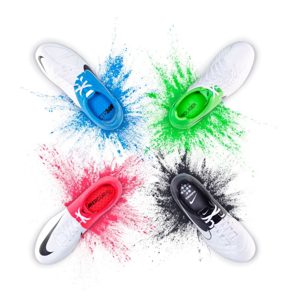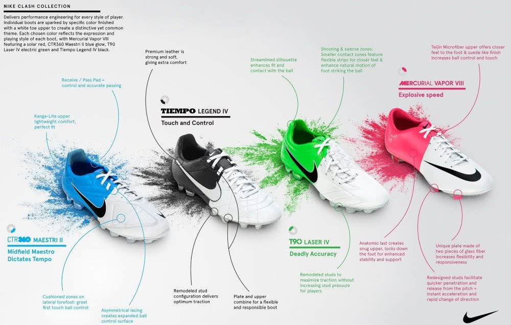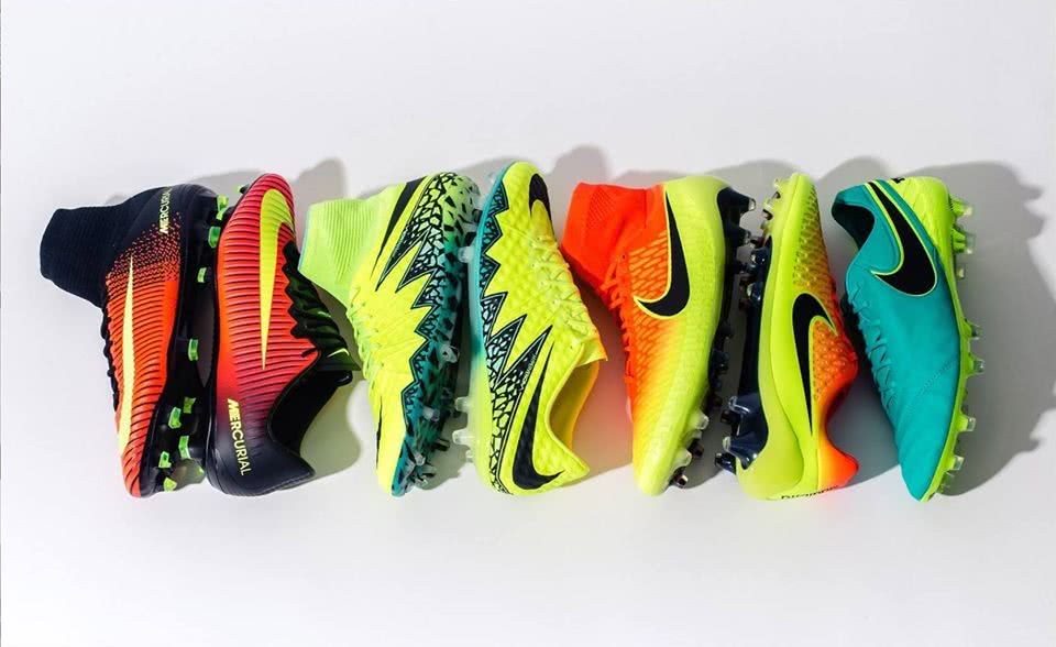 2012年欧洲杯赛场,耐克的大赛套装达到新的高度,当时的Clash Pack用糖果彩色开创了足球鞋撞色设计的先锋,影响一直延续至今日。有一说一,虽然2010年世界杯精英套装的技术含量更高,但是2012年的Clash套装给人的印象更深刻,为什么?配色讨喜!所以足球鞋的颜值有多重要可见一斑!