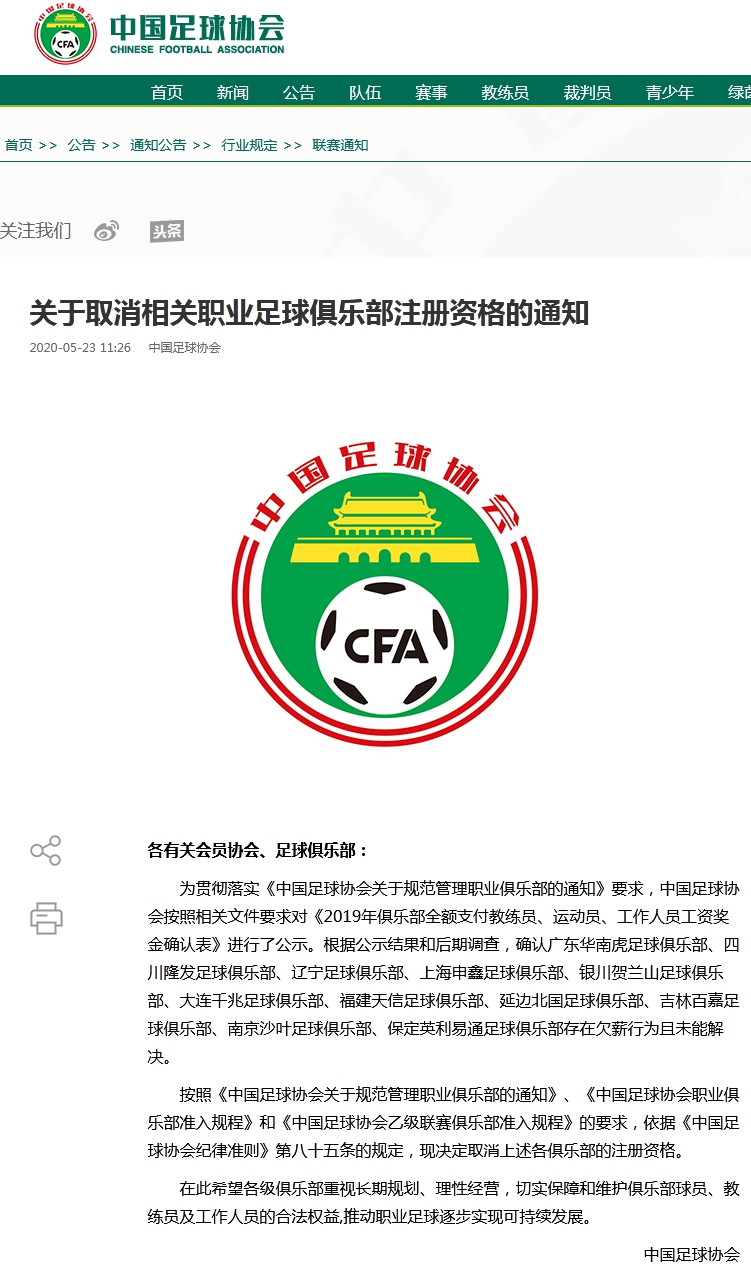中国足协按照《中国足球协会关于规范管理职业俱乐部的通知》《中国足球协会职业俱乐部准入规程》和《中国足球协会乙级联赛俱乐部准入规程》的要求,依据《中国足球协会纪律准则》第八十五条的规定,现决定取消上述各俱乐部的注册资格。