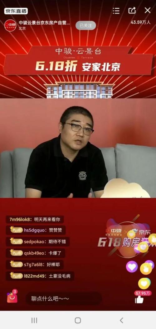 前有恒大携手佟大为直播卖房38套一秒被抢光,5月22日上午11点,京东零售集团CEO徐雷也亲自下场尝试直播卖房,并在直播中抽出一套6.18折特价房作为大奖。