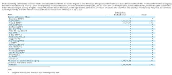 一份由阿里巴巴集团向美国证监会(SEC)提交财年报告显示,截止至今年7月2日,马云在阿里巴巴公司持股降至4.8%,蔡崇信持股降至1.6%,软银所持股份比例降至24.9%,仍为阿里巴巴的最大股东。除了持股比例之外,阿里巴巴的合伙人名单也有了些许变化。