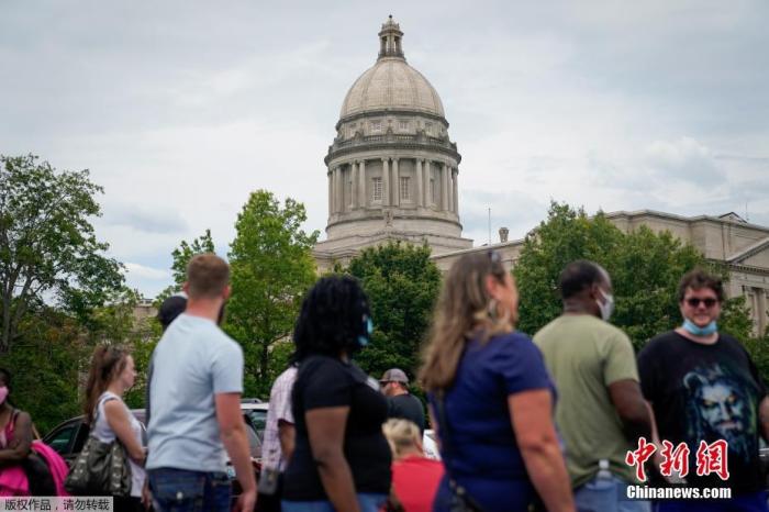 当地时间6月17日,美国肯塔基州国会大楼外,上千名在疫情期间失业的美国民众在此排队等候进入大楼。据悉肯塔基州在疫情期间开设了临时失业办公室。