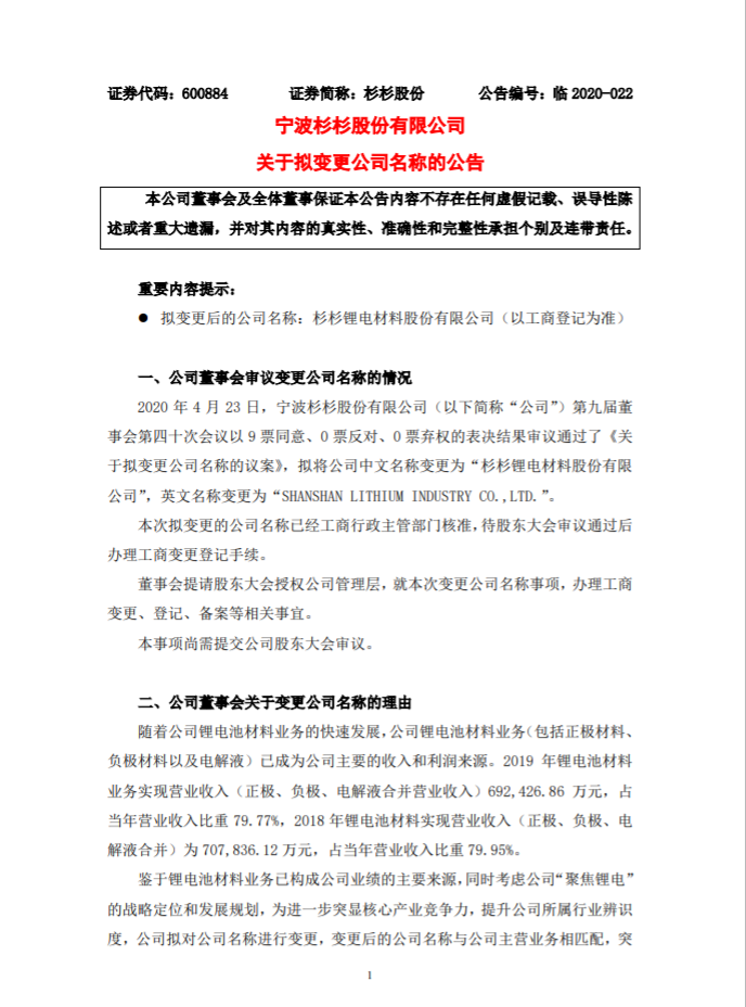4月23日,杉杉股份表决通过了《关于拟变更公司名称的议案》,拟将公司中文名称变更为“杉杉锂电材料股份有限公司”。