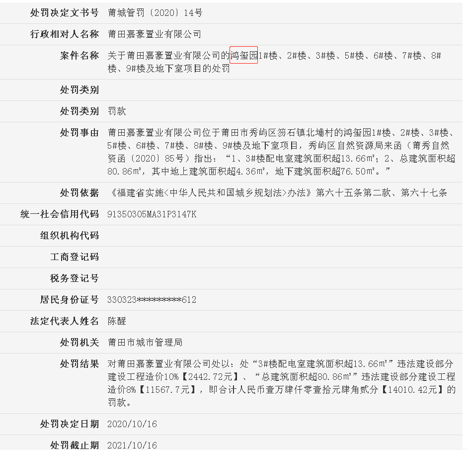 中国经济网记者查询发现,上述莆城管罚[2020]14号行政处罚文书的案件涉及项目为“鸿玺园1#楼、2#楼、3#楼、5#楼、6#楼、7#楼、8#楼、9#楼及地下室项目”。莆田嘉豪置业为该项目建设单位。