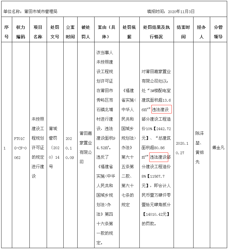 行政处罚决定文书指出,莆田嘉豪置业未按照建设工程规划许可证在莆田市秀屿区笏石镇北埔村进行建设,违法建设面积94.52平方米。